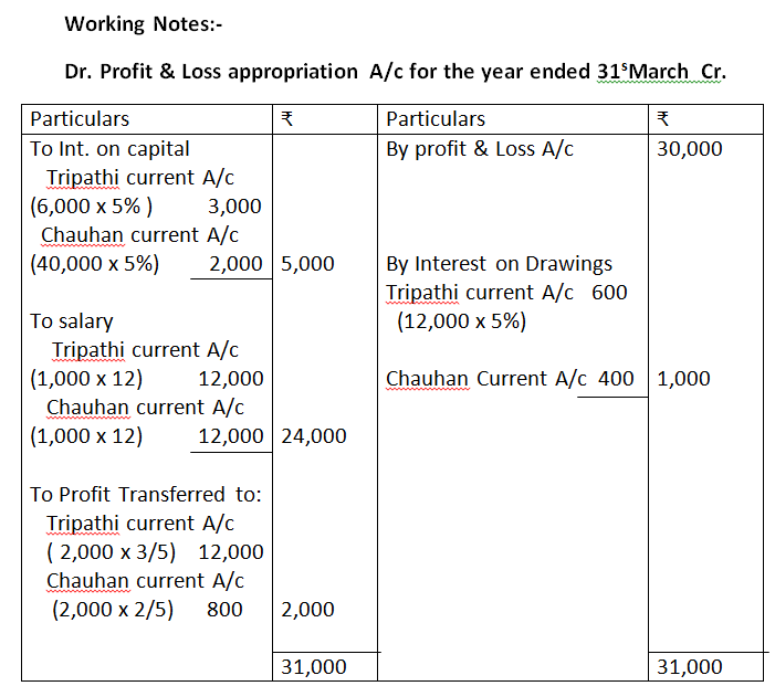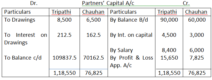 - Triphati & Chauhan are partners in a firm sharing profits and losses in the ratio of 3:2. Their capitals were Rs.60,000 and Rs.40,000 as on April 01, 2019. During the year they earned a profit of Rs.30,000. According to the partnership deed both the partners are entitled to Rs.1,000 per month as salary and 5% p.a. interest on their capital. They are also to be charged an interest of 5% p.a. on their drawings, irrespective of the period, which is Rs.12,000 for Tripathi, Rs.8,000 for Chauhan. Prepare Partner’s capital/current accounts when, capitals are fixed.