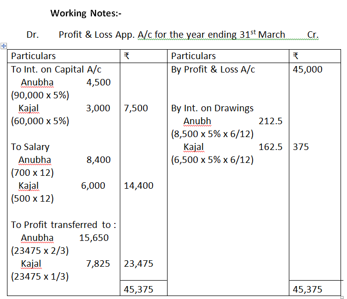 2. Anubha and Kajal are partners of a firm sharing profits and losses in the ratio of 2:1. Their capital, were Rs.90,000 and Rs.60,000. The profit during the year were Rs.45,000. According to partnership deed, both partners are allowed salary, Rs.700 per month to Anubha and Rs.500 per month to Kajal. Interest allowed on capital @ 5% p.a. The drawings during the year were Rs.8,500 for Anubha and Rs.6,500 for Kajal. Interest to be charged @ 5% p.a. on drawings. Prepare partners capital accounts, assuming that the capital account are fluctuating.
