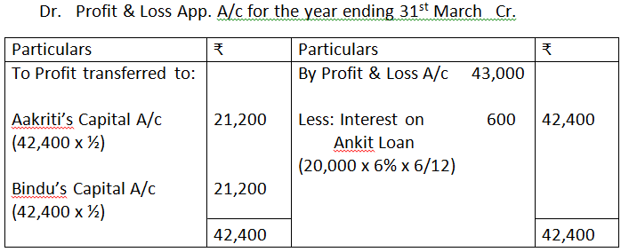 4. Aakriti and Bindu entered into partnership for making garment on April 01, 2019 without any Partnership agreement. They introduced Capitals of Rs.5,00,000 and Rs.3,00,000 respectively on October 01, 2019. Aakriti Advanced. Rs.20,000 by way of loan to the firm without any agreement as to interest. Profit and Loss account for the year ended March 31, 2020 showed profit of Rs.43,000. Partners could not agree upon the question of interest and the basis of division of profit. You are required to divide the profits between them by preparing Profit and Loss Appropriation Account. Also give reasons in Support of your answer.