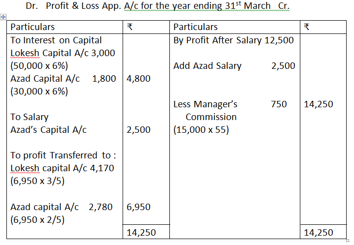 6. Lokesh and Azad are partners sharing profits in the ratio 3:2, with capitals of Rs.50,000 and 30,000, respectively. Interest on capital is agreed to be paid @ 6% p.a. Azad is allowed a salary of Rs.2,500 p.a. During 2016, the profits prior to the calculation of interest on capital but after charging Azad’s salary amounted to Rs.12,500. A provision of 5% of profits is to be made in respect of manager’s commission. Prepare partner’s capital accounts and profit and loss Appropriation Account.