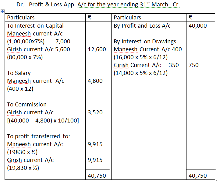 - The fixed capitals of Maneesh and Girish are Rs.1,00,000 and Rs.80,000, respectively. Their annual drawings were Rs.16,000 and 14,000, respectively. The net profit for the year ending March 31, 2019 amounted to Rs.40,000;