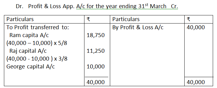 8. Ram, Raj and George are partners sharing profits in the ratio 5:3:2. According to the partnership agreement George is to get a minimum amount of Rs.10,000 as his share of profits every year. The net profit for the year 2013 amounted to Rs.40,000. Prepare the Profit and Loss Appropriation Account.
