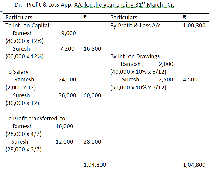 The profits for year ended March 31, 2017 before making above appropriations was Rs.1,00,300. The drawings of Ramesh and Suresh were Rs.40,000 and Rs.50,000, respectively. Interest on drawings amounted to Rs.2,000 for Ramesh and Rs.2,500 for Suresh. Prepare Profit and Loss Appropriation Account and partners’ capital accounts, assuming that their capitals are fluctuating.