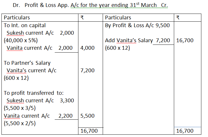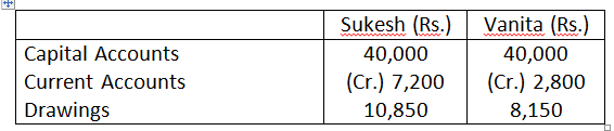 Net profit for the year, before charging interest on capital and after charging Sukesh’s salary was Rs.9,500. Prepare the Profit and loss Appropriation Account and the Partner’s Current Accounts.