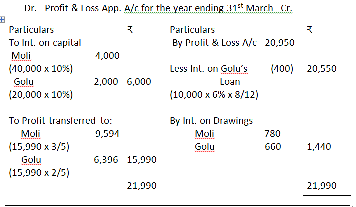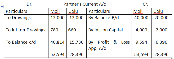 During the year, Moli withdraw Rs.1,000 per month at the beginning of every month whereas Golu withdrew Rs.1,000 per month at the end of every month. Profit for the year, before the above mentioned adjustments was Rs.20,950. Calculate interest on drawings show distribution of profits and prepare partners’ capital accounts.