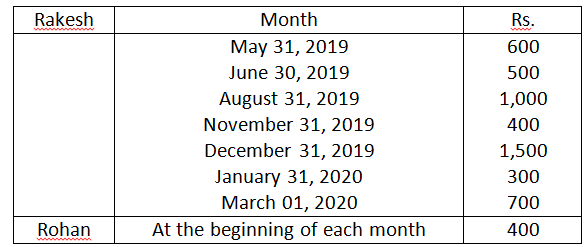 20. Rakesh and Roshan are partners, sharing profits in the ratio of 3:2 with capitals of Rs.40,000 and Rs.30,000, respectively. They withdrew from the firm the following amounts, for their personal use: