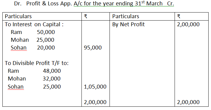 14. Rahul, Rohit and Karan started partnership business on April 1, 2019 with capitals of Rs.20,00,000, Rs.18,00,000 and Rs.16,00,000, respectively. The profit for the year ended March 2020 amounted to Rs.1,35,000 and the partner’s drawings had been Rahul Rs.50,000, Rohit Rs.50,000 and Karan Rs.40,000. The profits are distributed among partner’s in the ratio 3:2:1. Calculate the interest on capital @ 5% p.a.