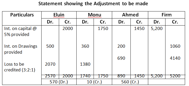 The partners were entitled to interest on capital @ 5% p.a. The drawings during the year were Eluin Rs.20,000; Monu, Rs.15,000 and Ahmed, Rs.9,000. Interest on drawings chargeable to partners were Eluin Rs.500, Monu Rs.360 and Ahmed Rs.200. The net profit during the year amounted to Rs.1,20,000. The profit sharing ratio was 3:2:1. Record necessary adjustment entry.