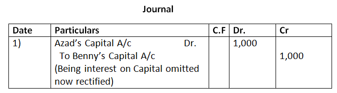 41. Azad and Benny are equal partners. Their fixed capitals are Rs.40,000 and Rs.80,000, respectively. After the accounts for the year have been prepared it is discovered that interest at 5% p.a. as provided in the partnership agreement, has not been credited to the capital accounts before distribution of profits. It is decided to make an adjustment entry at the beginning of the next year. Record the necessary journal entry.