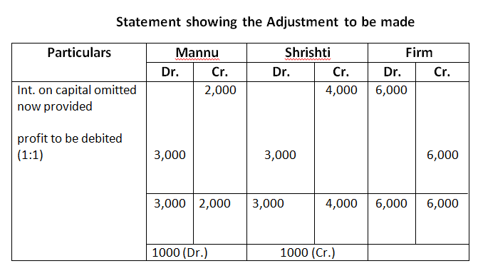 Profit for the year ended March 31, 2017 was Rs.5,000 which was divided in the agreed ratio, but interest @ 5% p.a. on capital and @ 6% p.a. on drawings was omitted. Adjust interest on drawings on an average basis for 6 months. Give the adjustment entry.
