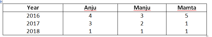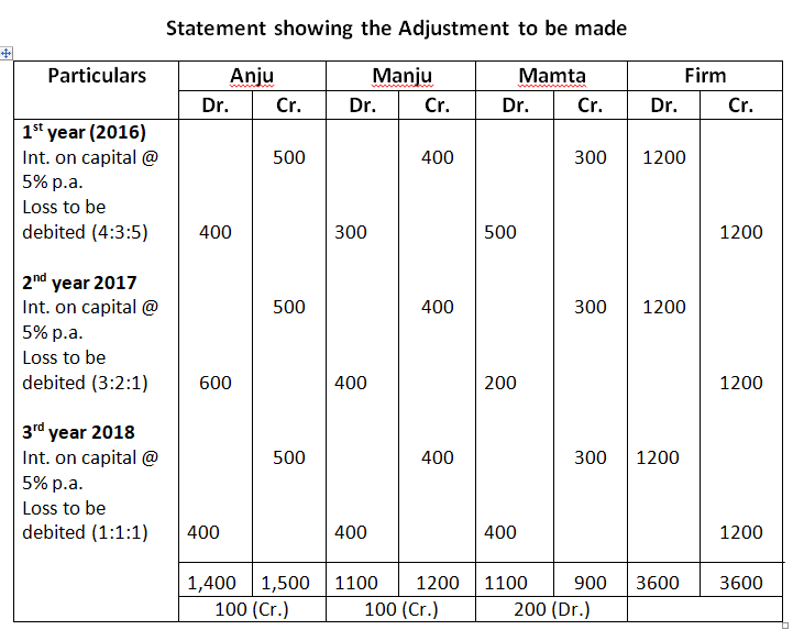 43. Anju, Manju and Mamta are partners whose fixed capitals were Rs.10,000, Rs.8,000 and Rs.6,000, respectively. As per the partnership agreement, there is a provision for allowing interest on capitals @ 5% p.a. but entries for the same have not been made for the last three years. The profit sharing ratio during there years remained as follows: