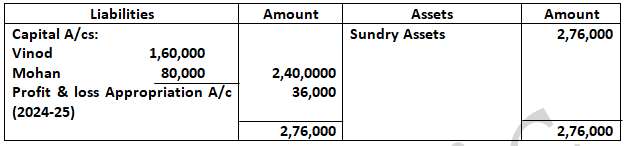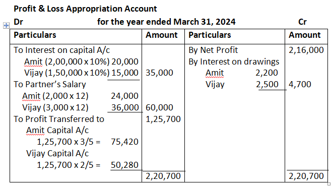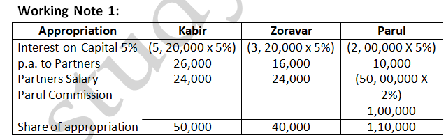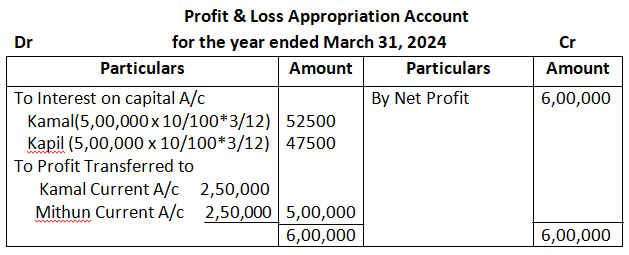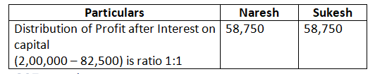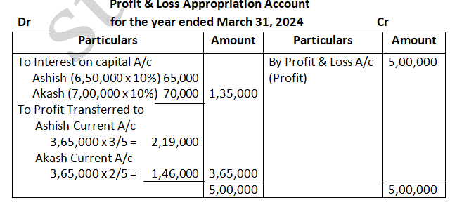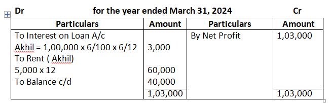 Dholu’s share of profit (excluding interest on capital but including salary) is guaranteed at a minimum of 1, 10,000 p.a. Any deficiency arising on that account shall be met by Asgar. The profit for the year ended 31st March, 2024 amounted to 4, 24,000