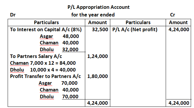 86. Asgar, Chaman and Dholu are partners in a firm. Their Capital Accounts stood at 6, 00,000; 5, 00,000 and 4, 00,000 respectively on 1st April, 2023. They shared Profits and Losses in the proportion of 4:2:3. Partners are entitled to interest on capital @ 8% per annum and salary to Chaman and Dholu @ 7,000 per month and 10,000 per quarter respectively as per the provision of the Partnership Deed.