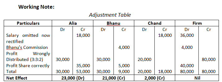 87. The partners of a firm, Alia, Bhanu and Chand distributed the profits for the year ended 31st March, 2017, 80,000 in the ratio of 3:3:2 without providing for the following adjustments: