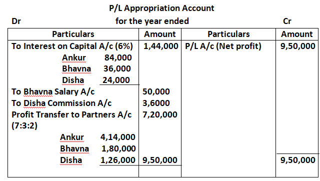 Bhavna’s Share of profit (excluding interest on capital) is guaranteed at not less than 1,70,000 p.a. Disha’s share of profit (including interest on capital but excluding commission) is guaranteed at not less than 1,50,000 p.a. Any Deficiency arising on that account shall be met by Ankur. The profit of the firm for the year ended 31st March, 2025 amounted to 9, 50,000.
