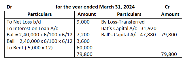 7. Bat and Ball are partners sharing the profits in the ratio of 2:3 with capitals of 1, 20,000 and 60,000 respectively. On 1st October, 2023, Bat and Ball give loans of 2, 40,000 and 1, 20,000 respectively to the firm. Bat had allowed the firm to use his property for business for a monthly rent of 5,000. Loss for the year ended 31st March, 2024 before rent and interest amounted to 9,000. Show distribution of profit/loss.