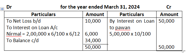 10. Nirmal and Pawan are partners sharing profits in the ratio of 3:2 the firm had given loan to Pawan of 5, 00,000 on 1st April, 2023. Interest was to be charged @ 10% p.a. the firm took loan of 2, 00,000 from Nirmal on 1st October, 2023. Before giving effect to the above, the firm incurred a loss of 10,000 for the year ended 31st March, 2024. Determine the amount to be transferred to Profit & Loss Appropriation Account.