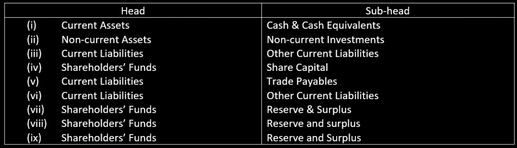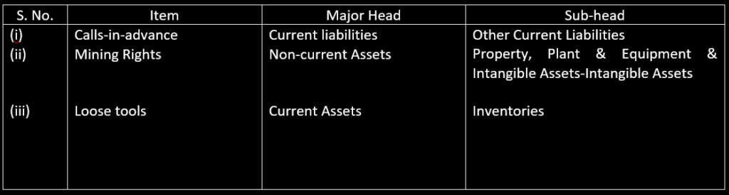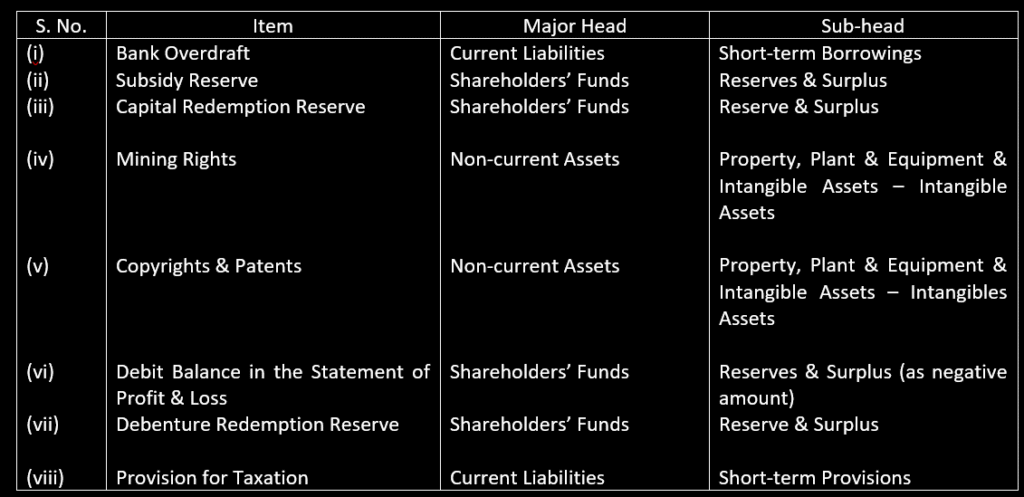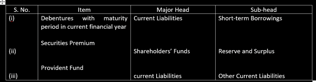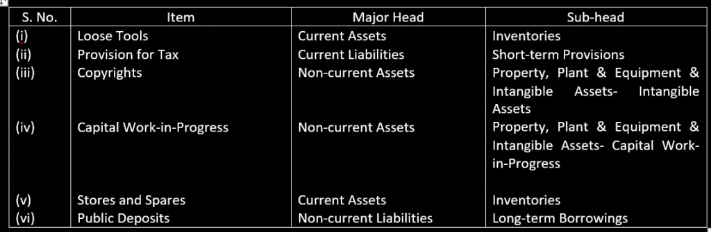 20. Classify the following items under major heads and sub-heads (if any) in the Balance sheet of the company as per Schedule III, Part I of the companies Act, 2013: