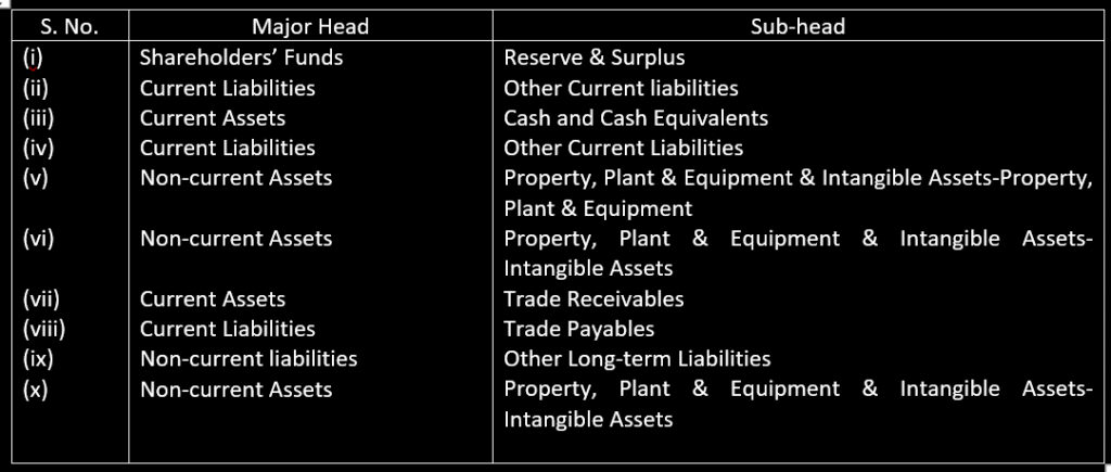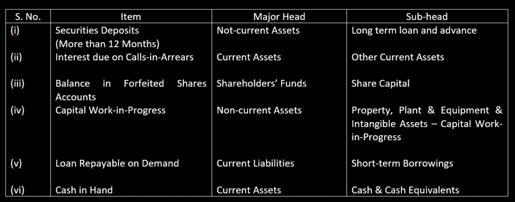 11. Classify the following items under Major heads and Sub-heads (if any) in the Balance Sheet of a company as per Schedule III of the Companies Act 2013: