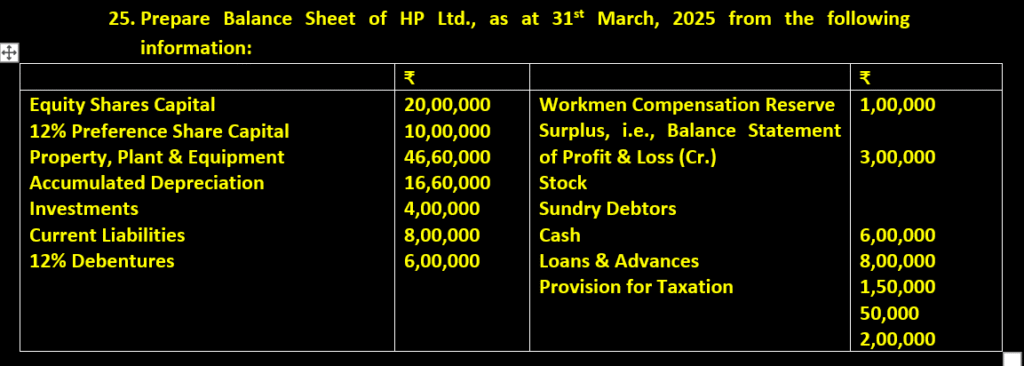 26. From the following information extracted from the books of Howrach Ltd., prepare Balance Sheet of the company as at 31st March, 2025 as per Schedule III of the Companies Act, 2013: