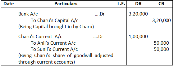 1. Manoj brought proportionate capital. He also brought his share of goodwill premium of 80,000 in cash.
