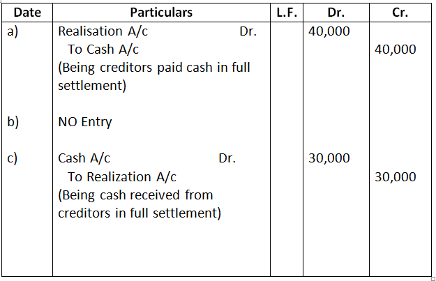 - Creditors worth Rs.85,000 accepted Rs.40,000 as cash and Investment worth Rs.43,000, in full settlement of their claim.