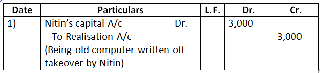 3. There was an old computer which was written-off in the books of accounts in the previous year. The same has been taken over by a partner Nitin for Rs.3,000. Journalise the transaction when the firm has been dissolved.