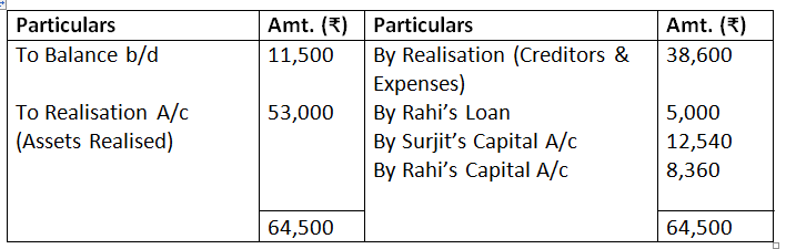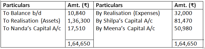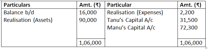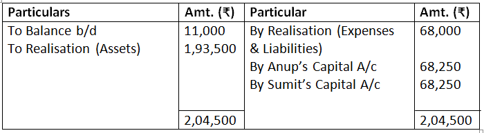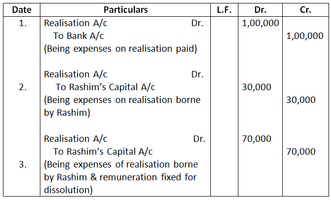 - Realisation expenses are to be borne by Rashim and he will be paid Rs.70,000 as remuneration for completing the dissolution process. The actual expenses incurred by Rashim were Rs.1,20,000.