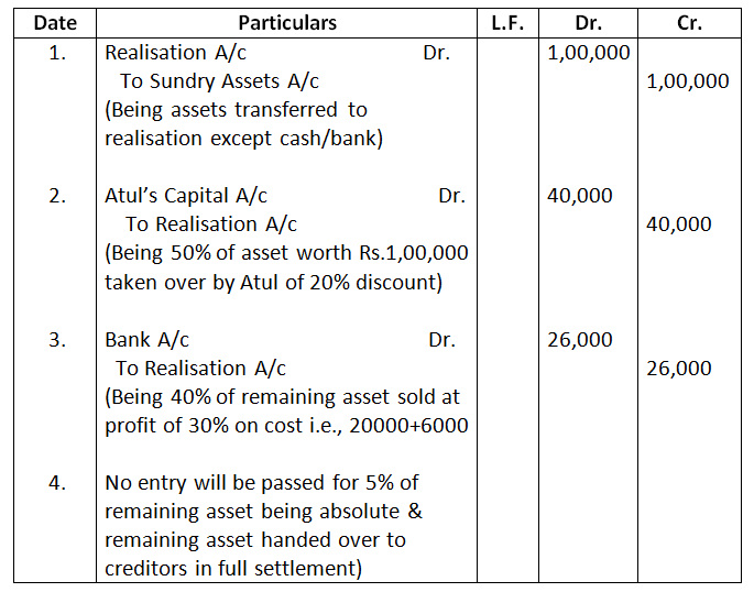 7. The book value of assets (other than cash and bank) transferred to Realisation Account is Rs.1,00,000. 50% of the assets are taken over by a partner Atul, at a discount of 20%; 40% of the remaining assets are sold at a profit of 30% on cost; 5% of the balance being obsolete, realised nothing and remaining assets are handed over to a Creditor, in full settlement of his claim.