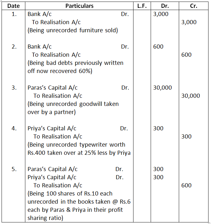 - Paras agreed to takeover the firm’s goodwill (not recorded in the books of the firm), at a valuations of Rs.30,000.