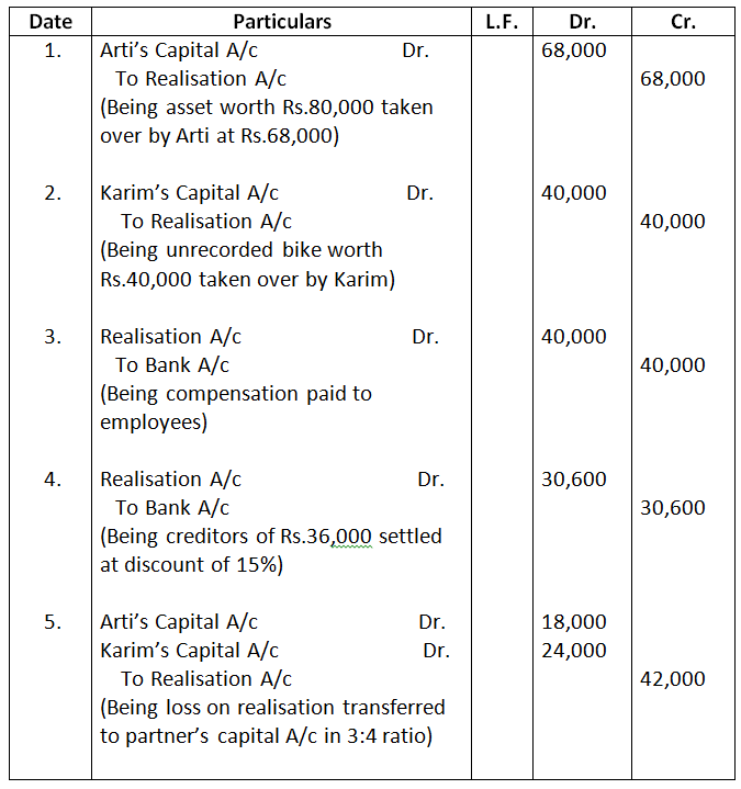 - Loss on realisation Rs.42,000 was to be distributed between Arti and Karim in the ratio of 3:4.