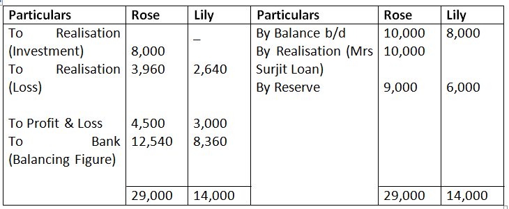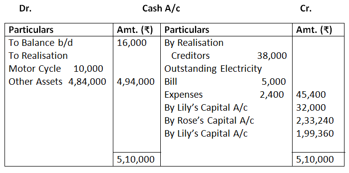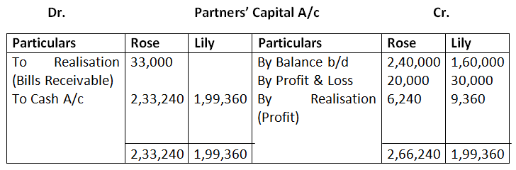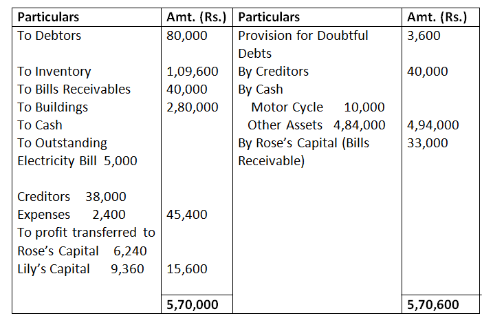 Rose and Lily decided the firm on the above date. Assets (except bills receivables) realised Rs.4,84,000. Creditors agreed to take Rs.38,000. Cost of realisation was Rs.2,400. There was a Motor Cycle in the firm which was bought out of the firm’s money, was not shown in the books of the firm. It was now sold for Rs.10,000. There was a contingent liability in respect of outstanding electric bill of Rs.5,000 which was paid Bill Receivable taken over by Rose at Rs.33,000.