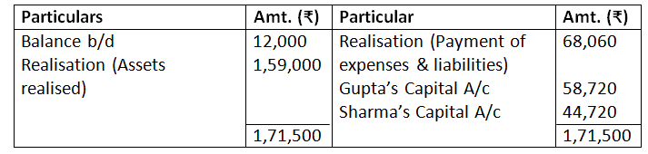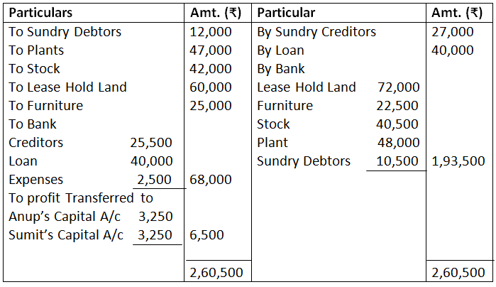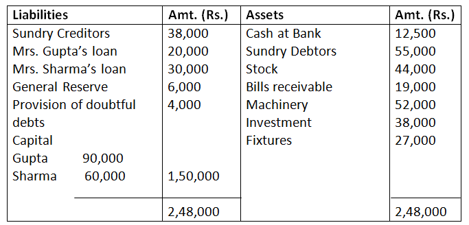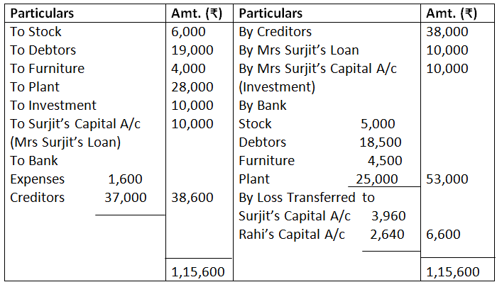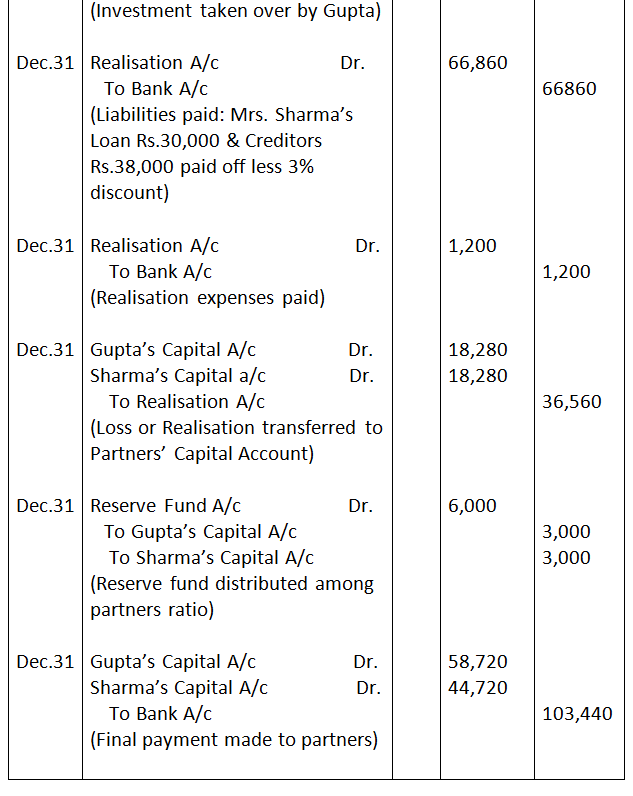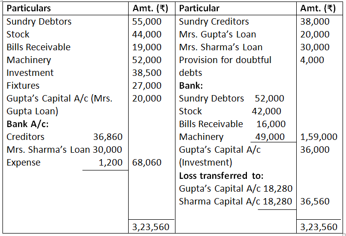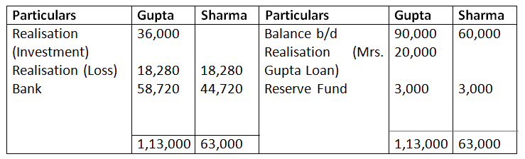 b. Investment was taken over by Gupta at agreed value of Rs.36,000 and agreed to pay of Mrs. Gupta’s loan.