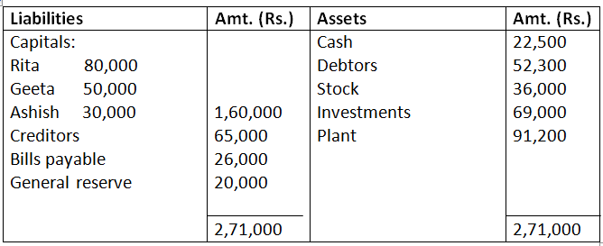 14. Rita, Geeta and Ashish were partners in a firm sharing profits/losses in the ratio of 3:2:1. On March 31, 2017 their balance sheet was as follows: