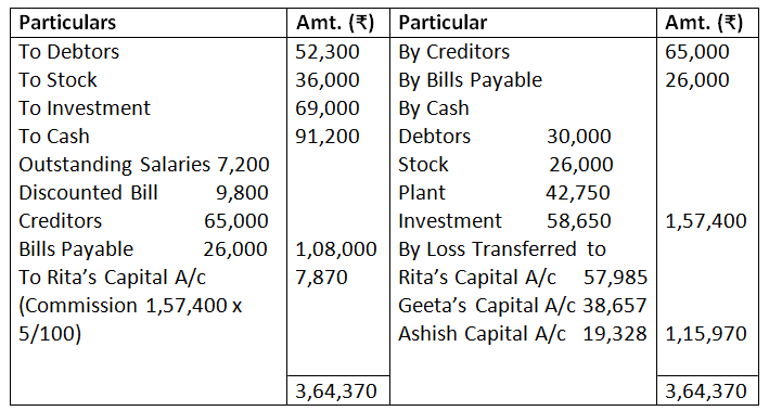 Note:- No treatment will be done for expenses on realisation Rs.4,100 as the firm has already paid 5% assets realised as commission for dissolution to Rita, Rs.4,100 actual expense will be paid by Rita personally.