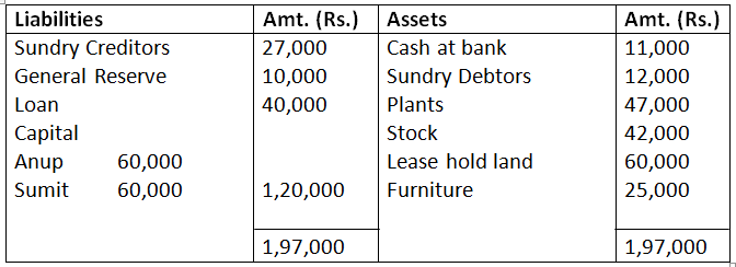15. Anup and Sumit are equal partners in a firm. They decided the partnership on March 31, 2017. When the balance sheet is as under: