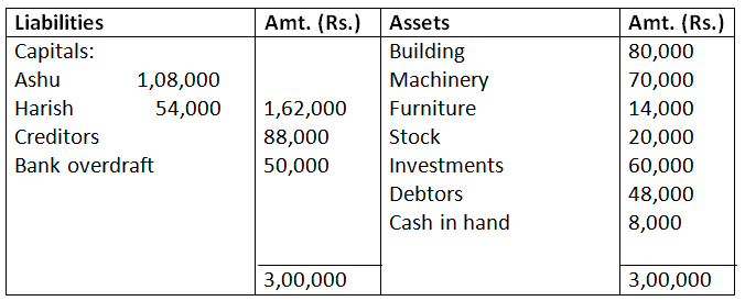16. Ashu and Harish are partners sharing profit and losses as 3:2. They decided to dissolve the firm on March 31, 2017. Their balance sheet on the above date was: