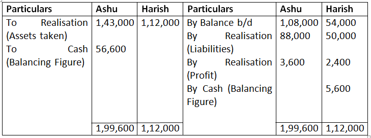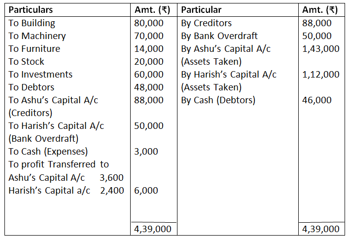 Ashu is to take over the building at Rs.95,000 and Machinery and Furniture is take over by Harish at value of Rs.80,000 Ashu agreed to pay Creditor and Harish agreed to meet Bank overdraft. Stock and Investments are taken by both partner in profit sharing ratio. Debtors realised for Rs.46,000, expenses of realisation amounted to Rs.3,000. Prepare necessary ledger account.