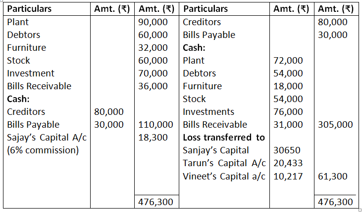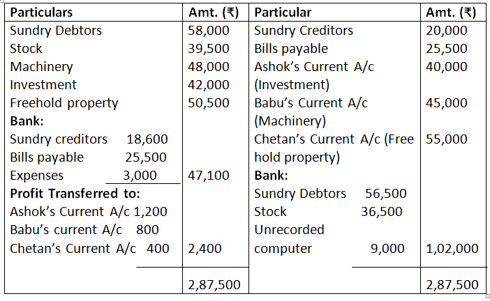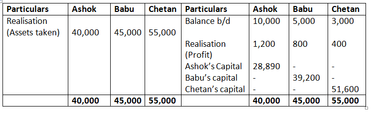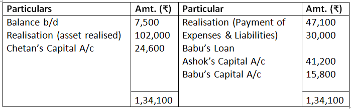 The machinery was taken over by Babu for Rs.45,000, Ashok took over the Investment for Rs.40,000 and Freehold property took over by Chetan at Rs.55,000. The remaining Assets realised as follows: Sundry Debtors Rs.56,500 and Stock Rs.36,500. Sundry Creditors were settled at discount of 7%. A Office computer, not shown in the books of accounts realised Rs.9,000. Realisation expenses amounted to Rs.3,000.