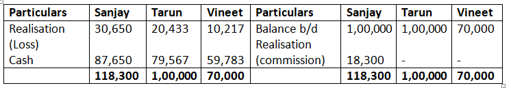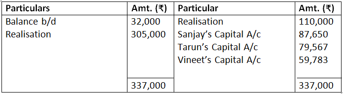 - Profit on Realisation amounting to Rs.18,000 is to be distributed between the partners Ashish and Tarun in the ratio of 5:7.