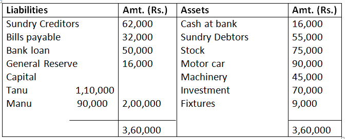 20. The following is the Balance Sheet of Tanu and Manu, who share profit and losses in the ratio of 5:3, On March 31, 2017: