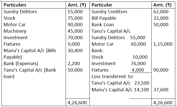 On the above date the firm is dissolved and the following agreement was made: Tanu agree to pay the bank loan and took away the sundry debtors. Sundry creditors accepts stock and paid Rs.10,000 to the firm. Machinery is taken over by Manu for Rs.40,000 and agreed to pay of bills payable at a discount of 5%. Motor car was taken over by Tanu for Rs.60,000. Investment realised Rs.76,000 and fixtures Rs.4,000. The expenses of dissolution amounted to Rs.2,000.