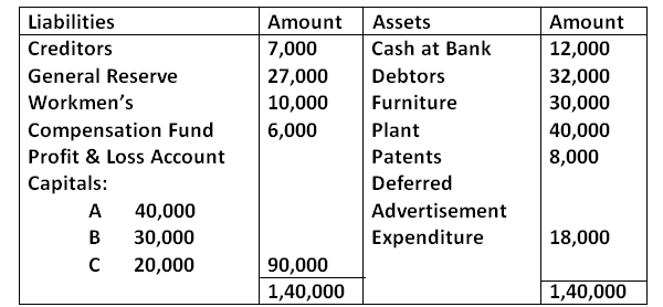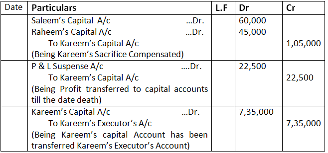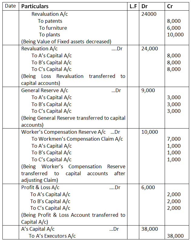 On A’s death it was found that patents were valueless, furniture was to be brought down to 24,000. Plant was to be reduced by 10,000 and there was a liability of 7,000 on account of workmen’s compensation. Pass the necessary Journal entries for the above at the time of A’s death.