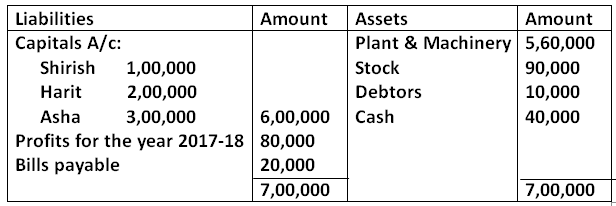 Balance Sheet of Shirish, Harit & Asha as at 31st March, 2018