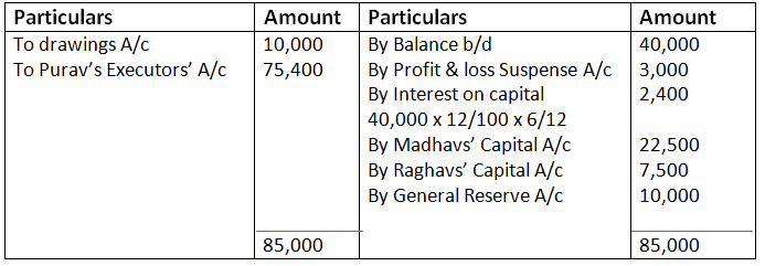 Purav’s share of profit was Rs.3,000 and the average profit of last four year was Rs.50,000. Purav’s drawings up to the date of death were Rs.10,000.