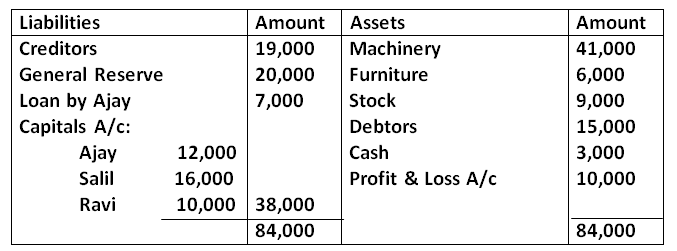 Q34. Ajay, Salil & Ravi partners in a firm sharing profits in the ratio of 5:3:2. Ajay died on 20th February, 2025. The balance sheet of the firm on that date was as follows:
