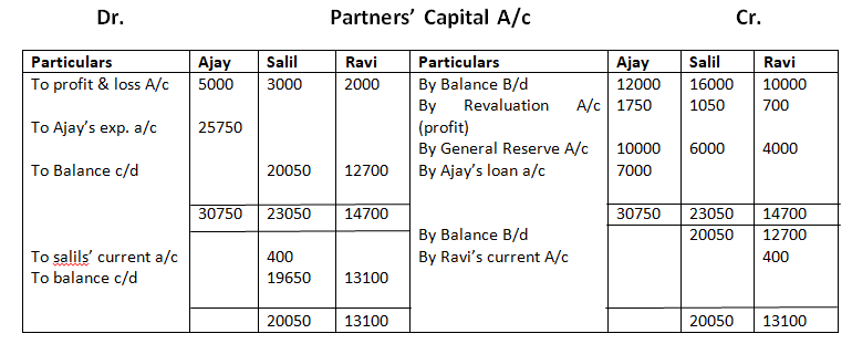 Prepare Revaluation Account, Partner’s Capital Accounts, Ajay’s Executors Account and the Balance Sheet of Salil & Ravi who decided to continue the business keeping their capital balances in their new profit sharing ratio. Any surplus or deficit was to be transferred to Current Accounts of the partners.