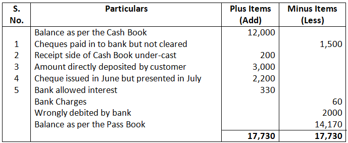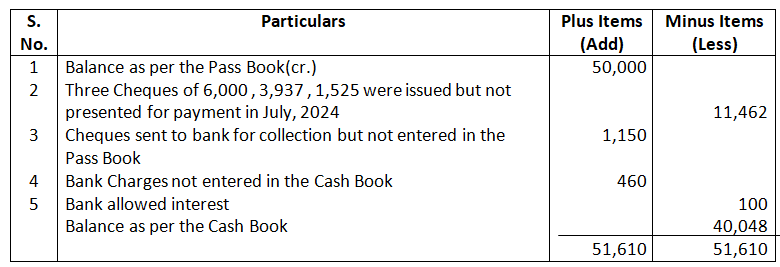 3. Two cheques of 500 and 650 sent to the bank for collection were not entered in the Pass Book by 31st July, 2024.