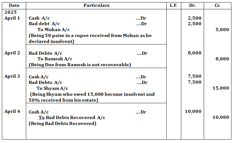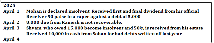 - Shyam became insolvent. Compensation of 75 paise in a rupee was received from his Official Receiver. He owed us 10,000