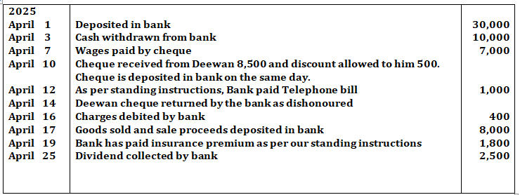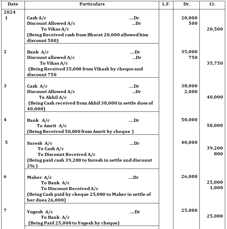 - Received from Vikas 35,000 by cheque, allowed him discount 750.